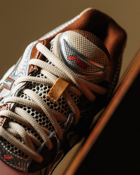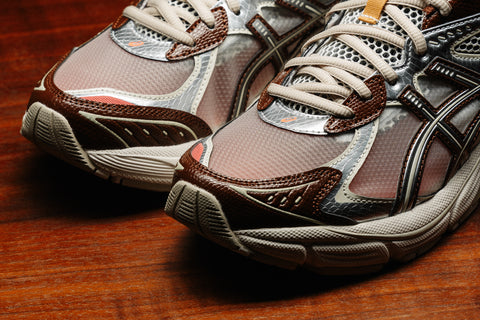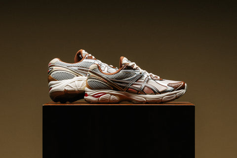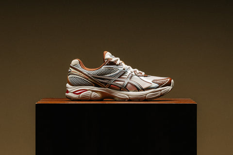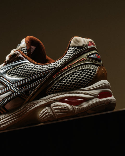 AUSTRALIA’S ABOVE THE CLOUDS, LED BY DIMITRI CALLIGEROS, TEAMS UP WITH ASICS AGAIN FOR A NEW TAKE ON THE GT-2160 SILHOUETTE. THIS EDITION EMBRACES A NATURAL COLOR PALETTE, FEATURING A TRANSPARENT OVERLAY ON THE FOREFOOT AND A LUSH MAUVE THAT TIES TOGETHER THE RED GEL UNIT AND INSOLES WITHIN A BROADER NEUTRAL SCHEME. DEEP BROWN ACCENTS AND CHROME HINTS ADD SOPHISTICATION, MARKING A DEPARTURE FROM THE 'SHAMROCK GREEN' MODEL OF LATE 2023.