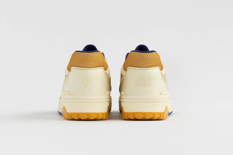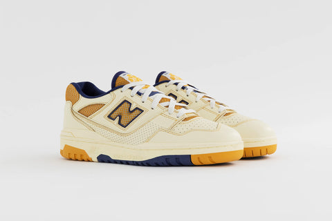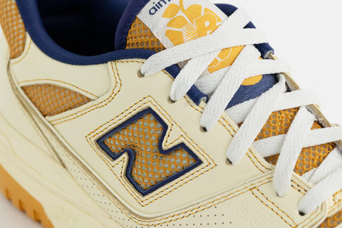 AIME LEON DORE AND NEW BALANCE HAVE COLLABORATED ONCE MORE TO UNVEIL THEIR NEWEST 550 ITERATION. STAYING TRUE TO ITS FORERUNNER, THIS LOW-TOP SILHOUETTE SHOWCASES A PERFORATED LEATHER UPPER COMBINED WITH BREATHABLE MESH. THE SHOE FEATURES A PREDOMINANTLY WHITE UPPER ACCENTED WITH VIBRANT YELLOW DETAILS. ENHANCED WITH A PADDED COLLAR AND A FOAM MIDSOLE, IT DELIVERS SUPERIOR CUSHIONING AND LASTING COMFORT FOR THE WEARER.