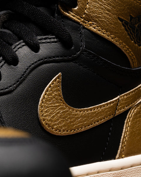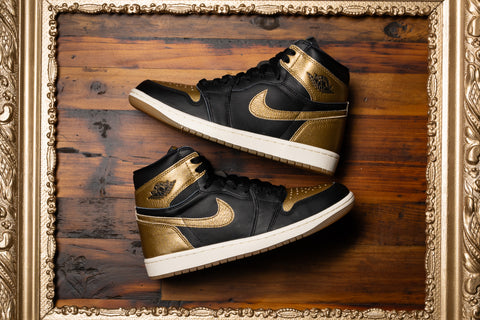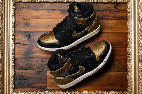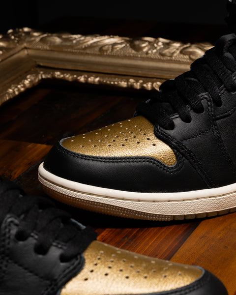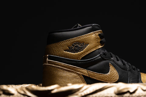 JORDAN BRAND INTRODUCES A ‘METALLIC GOLD’ VERSION TO ADD TO THE AIR JORDAN 1 LEGACY. THIS ITERATION SHOWCASES A BLACK LEATHER UPPER WITH GOLDEN HIGHLIGHTS, A NIKE AIR TAG ON THE TONGUE, AND A WHITE MIDSOLE PAIRED WITH A GUM RUBBER OUTSOLE FOR GRIP AND SUPPORT.