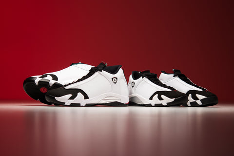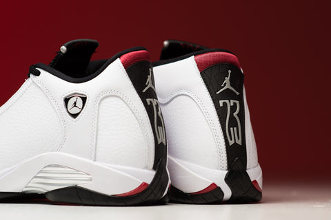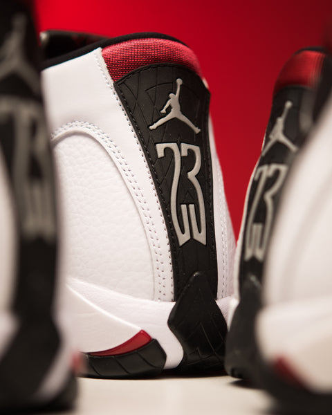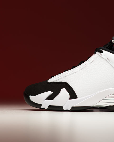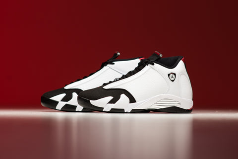 JORDAN BRAND HAS REINTRODUCED THE ICONIC JORDAN 14 ‘BLACK TOE,’ ORIGINALLY RELEASED IN 1998 AND INSPIRED BY FERRARI DESIGN. FEATURING A MIX OF WHITE, BLACK, VARSITY RED, AND METALLIC SILVER, THIS MODEL SHOWCASES SMOOTH LEATHER PANELS, A WHITE MIDSOLE WITH METALLIC ACCENTS, AND CLASSIC “JUMPMAN” AND “23” BRANDING ON THE HEELS, FINISHED WITH A BLACK RUBBER SOLE.