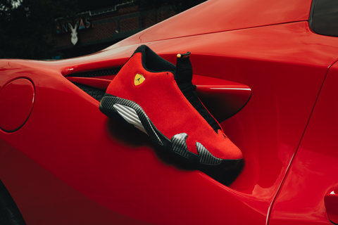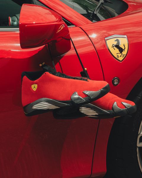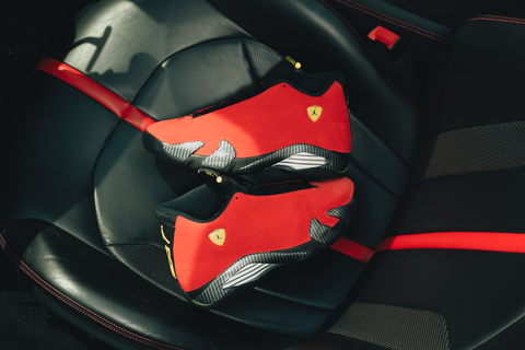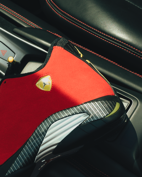 Inspired by Italian supercar engineering, the Air Jordan 14 ‘Ferrari’ pairs bold racing style with high-performance design. Red suede uppers echo the paint jobs of MJ’s favorite cars, while carbon fiber midsole shanks and metallic detailing reinforce its speed-driven look. The iconic shield logo and tire tread-inspired outsole complete the design—made to move fast and turn heads.
