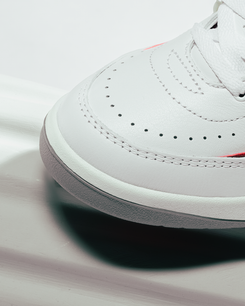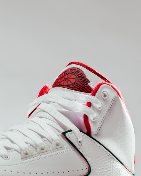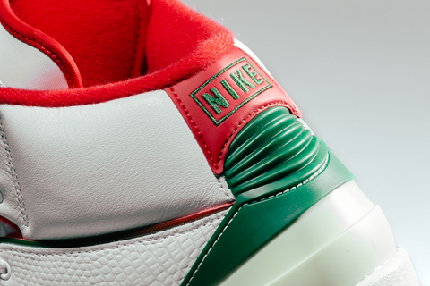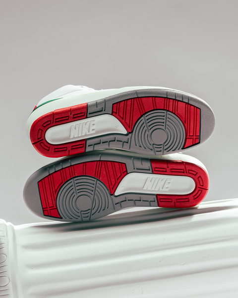 THE AIR JORDAN 2 HAS ALWAYS REPRESENTED A DEPARTURE TOWARDS LUXURY AND SOPHISTICATION COMPARED TO ITS PREDECESSOR. JUST AS THE SHOE'S DESIGN DREW INSPIRATION FROM ITALY'S RENOWNED CRAFTSMANSHIP, THIS NEW VARIANT VERSION ALSO PAYS HOMAGE TO ITALIAN AESTHETICS. THE SNEAKER MIMICS THE ITALIAN FLAG, INCORPORATING RED AND GREEN ACCENTS INTO ITS TRIMS AND DETAILS. ITS FOUNDATION IS CRAFTED FROM HIGH-QUALITY WHITE LEATHER, ELEGANTLY COMPLEMENTING THE WEATHERED, AGED LOOK OF THE HEEL CLIP AND MIDSOLE, WHICH HAS TAKEN ON A CHARMING YELLOWED PATINA.