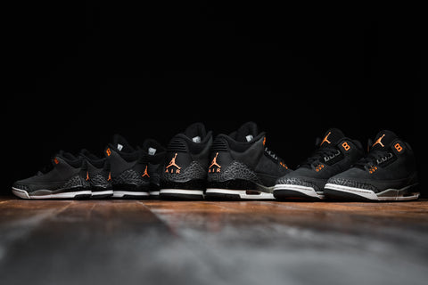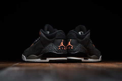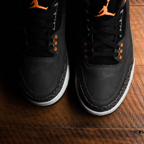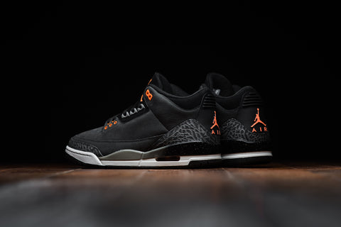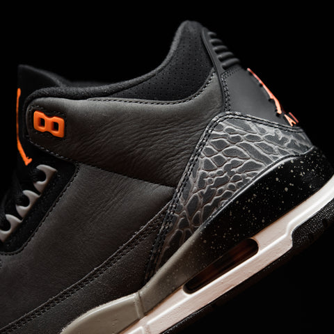 DRAPED IN A SOPHISTICATED COLOR PALETTE OF NIGHT STADIUM, TOTAL ORANGE, AND BLACK, THE AIR JORDAN 3 'FEAR' EXUDES OPULENCE WITH ITS DARK GREY SUEDE UPPER, EMPHASIZING A SENSE OF PREMIUM CRAFTSMANSHIP. FURTHER ENHANCING ITS AESTHETIC, THE SNEAKER SPORTS A UNIQUE SPECKLED BLACK AND WHITE MIDSOLE AT THE REAR, HARMONIZING PERFECTLY WITH A BLACK RUBBER OUTSOLE. THE DESIGN IS ELEVATED BY VIVID ORANGE ACCENTS THROUGHOUT, CREATING A CAPTIVATING VISUAL CONTRAST.