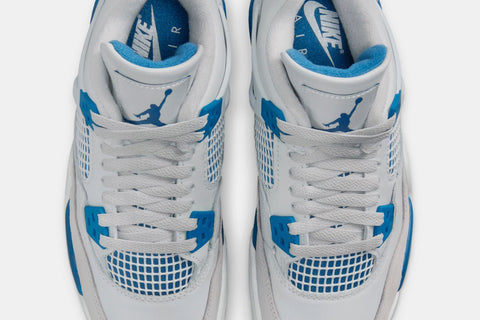 THE AIR JORDAN 4 'MILITARY BLUE' IS A FAN FAVORITE FOR GOOD REASON. IT SHOWCASES A CLASSIC OFF-WHITE, MILITARY BLUE, AND NEUTRAL GREY COLOR SCHEME, CRAFTED FROM OFF-WHITE LEATHER WITH NEUTRAL GREY OVERLAYS. THE MILITARY BLUE ACCENTS ON THE EYELETS, MIDSOLE, HEEL TABS, AND JUMPMAN LOGOS ADD TO ITS ICONIC LOOK. COMPLETING THE DESIGN ARE "NIKE AIR" BRANDING ON THE HEELS AND A WHITE, BLUE, AND GREY RUBBER OUTSOLE.