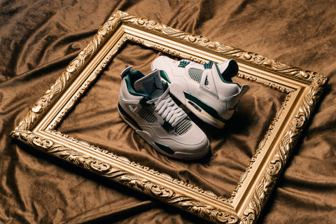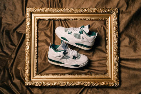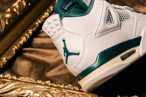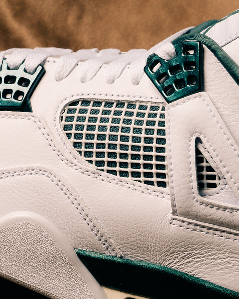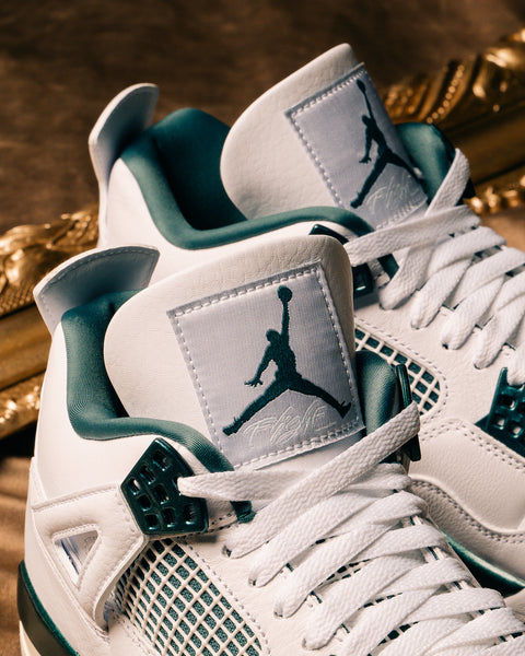 THE BELOVED AJ4 RETURNS WITH A LITTLE EXTRA SHINE, BOASTING A SLEEK COLOR COMBINATION AND ICONIC FEATURES. THE AIR JORDAN 4 RETRO ‘OXIDIZED GREEN’ SPORTS A CLEAN WHITE LEATHER UPPER WITH TONAL QUARTER PANEL NETTING AND GREY MOLDED EYELETS. CONTRASTING GREEN ACCENTS ENHANCE THE SUPPORT WINGS AND BACK TAB, BOTH FEATURING EMBOSSED JUMPMAN BRANDING. THE WOVEN TONGUE TAG ALSO DISPLAYS A SECOND JUMPMAN LOGO. A HINT OF GREEN FURTHER ACCENTUATES THE LIGHTWEIGHT POLYURETHANE MIDSOLE, WHICH INCLUDES AN EXPOSED AIR-SOLE UNIT IN THE HEEL.