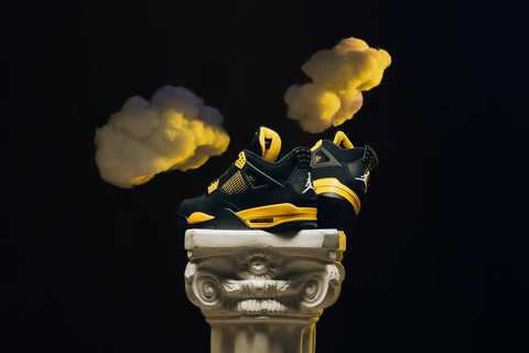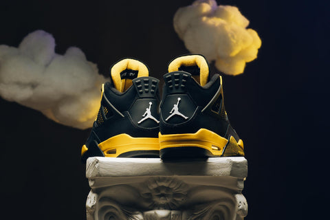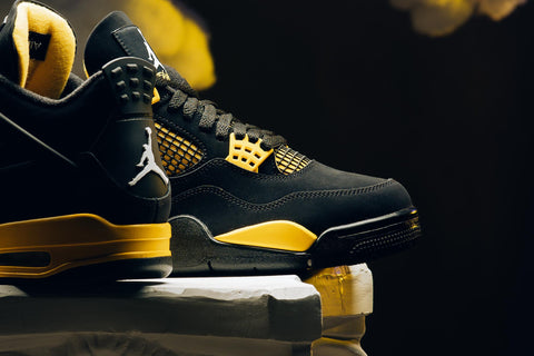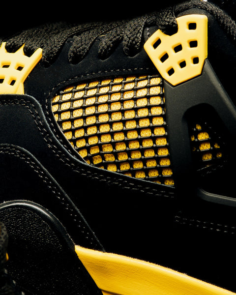 ALTHOUGH IT DONS THE SAME COLORS AS AN ACTUAL HORNET, THIS COLORWAY ISN'T INSPIRED BY MICHAEL JORDAN'S BASKETBALL TEAM, BUT INSTEAD HIS MOTORSPORT TEAM FROM NEARLY TWO DECADES AGO. FOR THE FIRST TIME SINCE 2006, THE AIR JORDAN 4 'THUNDER' IS HITTING SHELVES AND HAS NEARLY THE EXACT SAME SPECIFICATIONS AS ITS OG COUNTERPART.