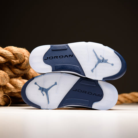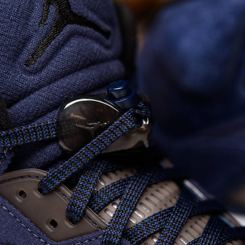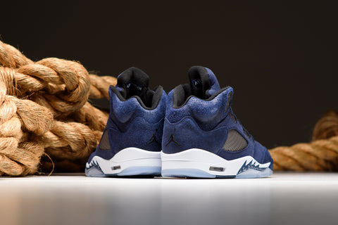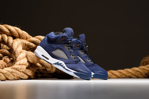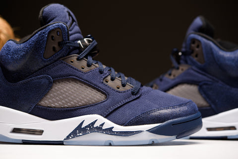 COLLOQUIALLY KNOWN AS 'GEORGETOWN', THIS DARK BLUE JORDAN 5 FEATURES A MIDSOLE AND UPPER DECKED OUT IN FOOTBALL GREY AND MIDNIGHT NAVY. THE DEEP BLUE HUE COVERS A SIGNIFICANT PORTION OF THE SHOE'S UPPER, ENVELOPING THE TEXTILE AND SUEDE ELEMENTS, AS WELL AS VARIOUS ACCENT DETAILS. TO COMPLETE THE LOOK, TOUCHES OF BLACK ARE INCORPORATED THROUGH THE NETTING, EYE STAYS, AND LINING.
