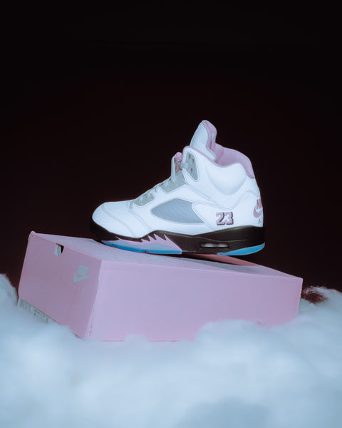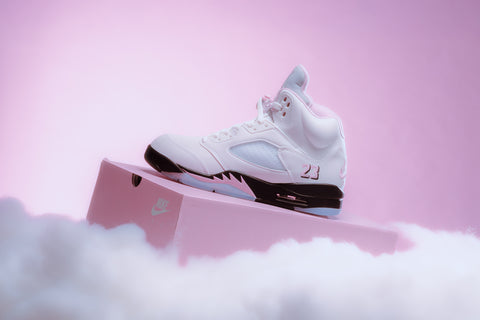 The Air Jordan 5 in White and Medium Soft Pink channels a soft femininity to a striking statement sneaker. Crisp white leather uppers contrast with delicate pink accents on the lace toggles, lining, and midsole, accentuating the reflective tongue and translucent outsole. Amplifying the classic AJ5 aesthetic with a delicate flair has created a clean, and premium option that blends what the iconic sneaker is known for with subtle tonal appeal.