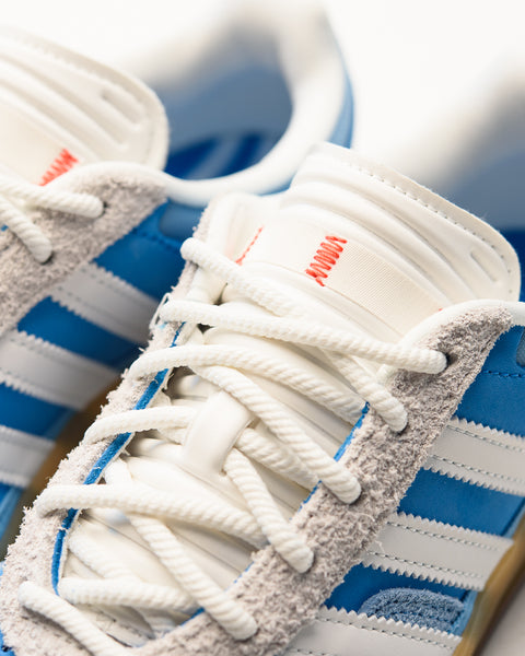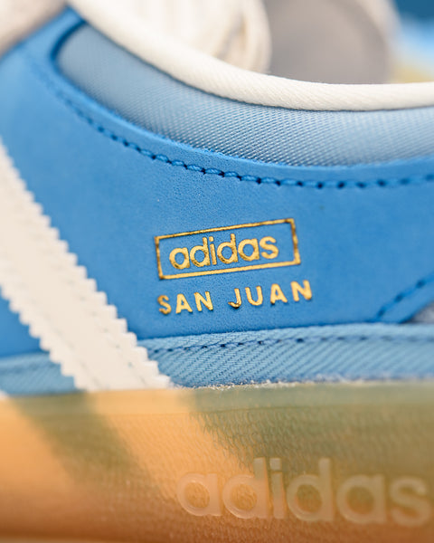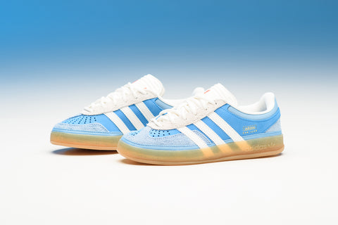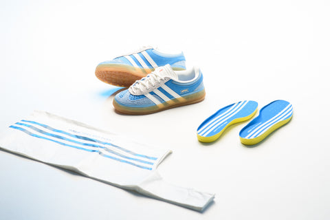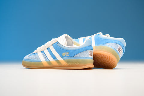 BAD BUNNY'S LATEST ADIDAS COLLAB, THE 'SAN JUAN,' IS INSPIRED BY THE CRYSTAL CLEAR BLUE BEACHES STRAIGHT FROM HIS HOMETOWN. THE SNEAKER IS DIPPED IN VIBRANT SHADES OF BLUE HUES, CAPTURING THE ESSENCE OF SAN JUAN'S SHORES WITH SUBTLE GRAY AND WHITE ACCENTS ON THE VAMP AND EYELETS. GRAY LACE COLLARS AND CRISP WHITE STRIPES POP AGAINST THE BACKDROP, WHILE THE SIGNATURE GUM SOLES GROUND THE LOOK. DISTINCTIVE TOUCHES LIKE A WARPED TOE OVERLAY AND A LAYERED TONGUE MAKE THIS GAZELLE INDOOR A UNIQUE PAIR IN BAD BUNNY'S LINEUP.