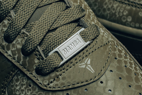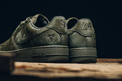 The Kobe Bryant x Nike Air Force 1 Low ‘Cargo Khaki’ blends classic AF1 structure with snakeskin textures that give the shoe a sharp edge. The tonal military palette sets a grounded tone while the Sheath logo and stitched jersey numbers create subtle links to Kobe’s legacy. It lands in that sweet spot between collectible and wearable, making it an easy pair to build into a weekly rotation. This colorway feels intentional and understated in a way that aligns with what fans look for in a Kobe inspired silhouette.