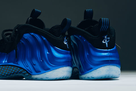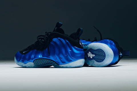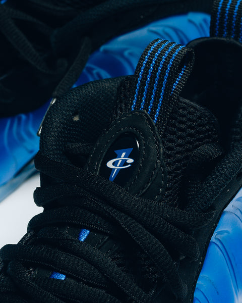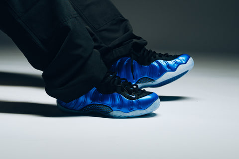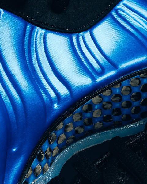NIKE CONTINUES TO CELEBRATE THE AIR FOAMPOSITE ONE WITH THE RETURN OF THE ICONIC ‘ROYAL’ COLORWAY FROM 1997. THIS VERSION BOASTS A METALLIC BLUE FOAMPOSITE UPPER, COMPLEMENTED BY BLACK NUBUCK ACCENTS ON THE COLLAR AND EYESTAY. IT KEEPS CLASSIC FEATURES LIKE THE BLUE-BORDERED WHITE MINI-SWOOSH AND THE EXPOSED BLACK AND BLUE CARBON SHANK. PENNY HARDAWAY’S 1 CENT LOGO IS DISPLAYED ON THE TONGUE AND BACK TAB, WITH A TRANSLUCENT RUBBER OUTSOLE FINISHING THE DESIGN.