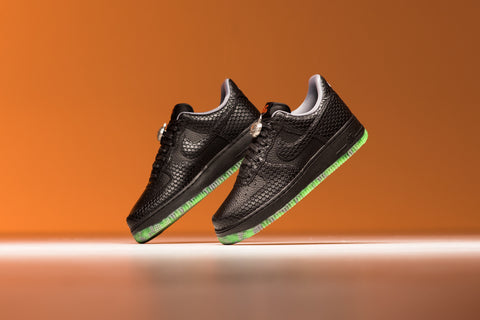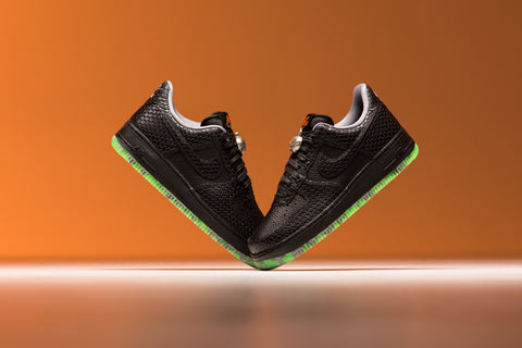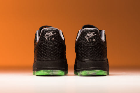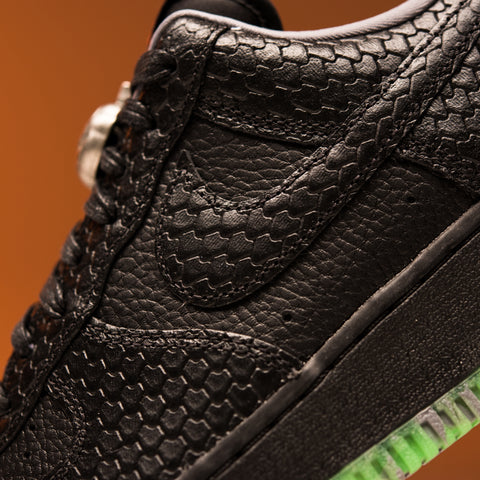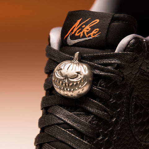 AT FIRST GLANCE, THE CREEPY MODEL OF NIKE'S AIR FORCE 1 LOW SHOWCASES UPPERS ENTIRELY IN BLACK, SKILLFULLY CREATED FROM A TUMBLED LEATHER FOUNDATION WITH STYLISH SNAKESKIN ACCENTS. HINTS OF GRAY AND ORANGE ARE TASTEFULLY INCORPORATED INTO THE COLLAR LINING, THE EMBROIDERED NIKE AIR HEEL LOGO, AND THE NIKE TONGUE TAG, ADDING A TOUCH OF VIBRANCY. FURTHER INTRICATE TOUCHES CAN BE FOUND IN THE FORM OF A SILVER METALLIC JACK-O'-LANTERN DUBRAE AND THE FOREST-THEMED NIKE-BRANDED PUMPKIN INSOLES, CREATING A MORE FESTIVE AMBIANCE.