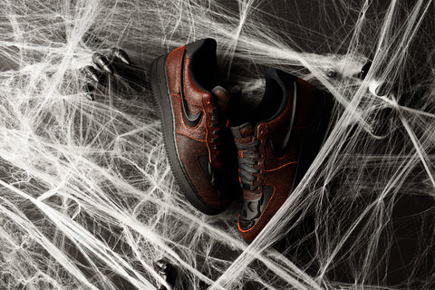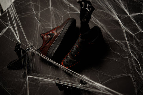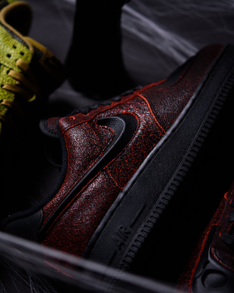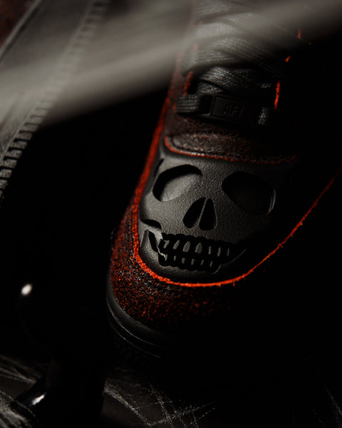 THE SKULL-TOED SHOE IS ONE OF SEVERAL FROM NIKE CELEBRATING THE EERIE SEASON WITH A HALLOWEEN EDITION OF THE ICONIC AIR FORCE 1 LOW. THE SNEAKER SHOWCASES A STRIKING BLACK AND CRIMSON COLORWAY, WITH STANDOUT DETAILS LIKE A BOLD SKULL DESIGN ON THE TOE BOX AND A CRACKED LEATHER BASE IN A BLOOD-RED HUE, PERFECT FOR CAPTURING THE HOLIDAY.