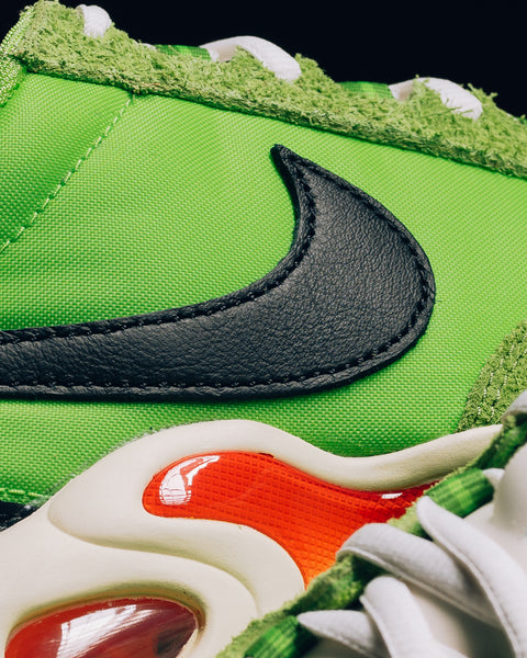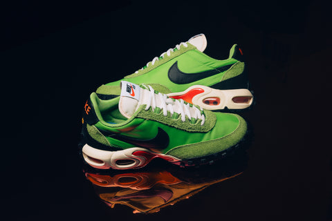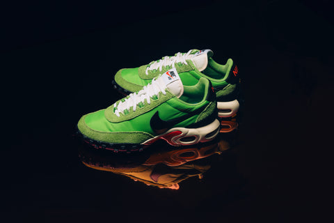 NIKE PRESENTS THE HYBRID SILHOUETTE, THE AIR WAFFLE RACER, MERGING TWO ICONIC DESIGNS: THE WAFFLE RACER AND THE AIR MAX PLUS. THIS UNIQUE MODEL FEATURES THE CLASSIC WAFFLE RACER UPPER COMBINED WITH A SPLIT SOLE — A WAFFLE RACER FOREFOOT AND A TUNED AIR HEEL — RESULTING IN AN AESTHETIC THAT BALANCES VINTAGE AND MODERN VIBES. THE DEBUT COLORWAY KEEP THINGS BOLD WITH BRIGHT GREEN AND PURPLE TONES, ECHOING OG WAFFLE TRAINER PALETTES.⁠