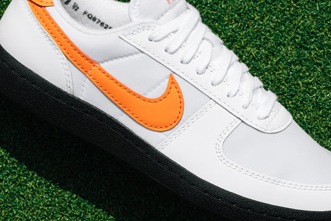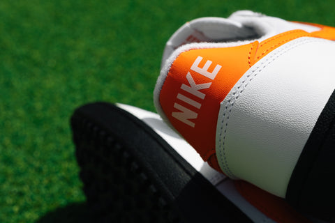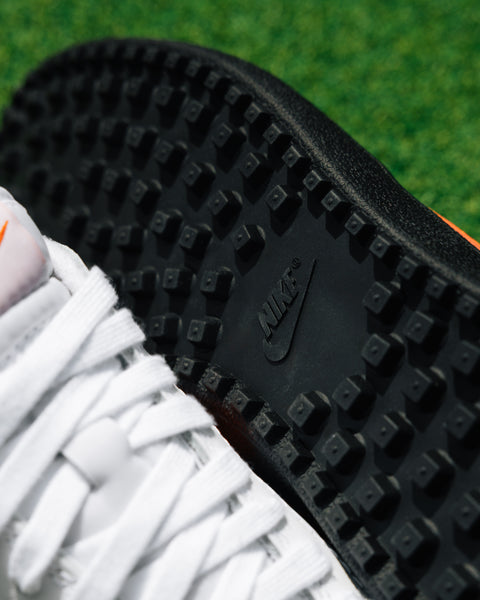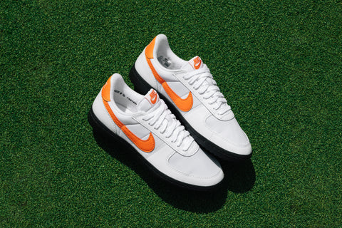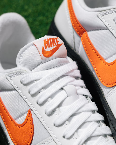 SHORTLY AFTER INTRODUCING THE FIELD GENERAL 82 SILHOUETTE IN JANUARY, NIKE UNVEILED A NEW 'ORANGE BLAZE' ITERATION. THIS VERSION MAINTAINS THE ORIGINAL SHAPE WITH A PREDOMINANTLY WHITE LEATHER AND CANVAS UPPER. IT FEATURES 'ORANGE BLAZE' ACCENTS ON THE SWOOSH AND TONGUE TAG, GIVING IT A FRESH LOOK COMPARED TO THE EARLIER RELEASE.
