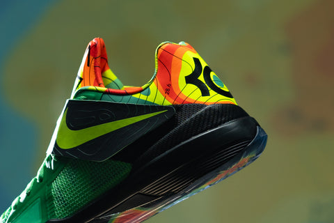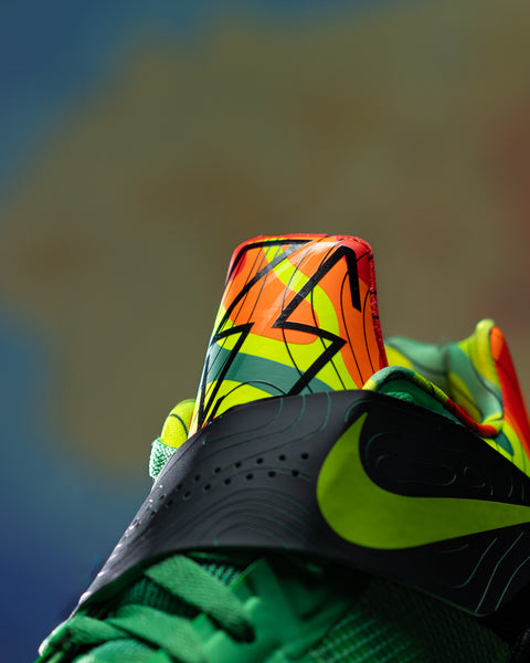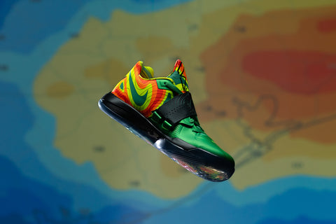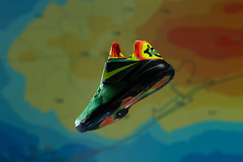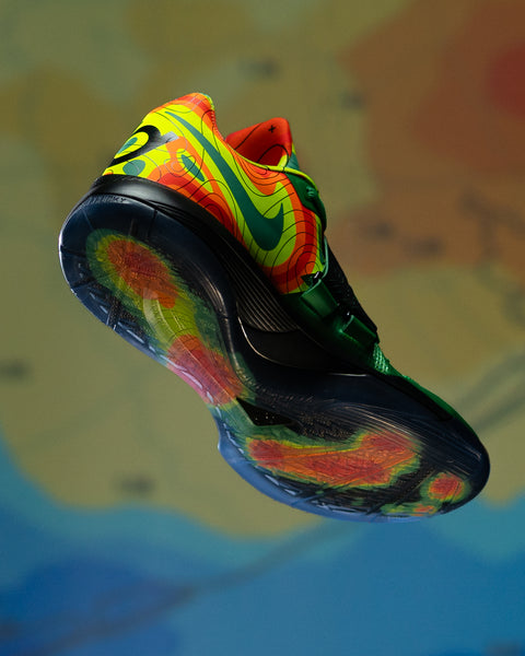 ONE OF KEVIN DURANT'S MOST COVETED SNEAKERS, THE NIKE ZOOM KD 4 'WEATHERMAN,' IS MAKING A RETURN. ORIGINALLY RELEASED IN 2011, THIS MEMORABLE COLORWAY WAS INSPIRED BY DURANT'S HYPOTHETICAL CAREER CHOICE AS A METEOROLOGIST. THE 'WEATHERMAN' NIKE ZOOM KD 4 STAYS TRUE TO THE OG DESIGN, FEATURING A LUSH GREEN, VOLT, BLACK, AND TEAM ORANGE COLOR SCHEME. THE FOCAL POINT OF THIS PAIR IS THE RADAR-LIKE GRAPHIC SEEN ON THE BACK HALF OF THE SNEAKER, MID-FOOT STRAP, AND UNDERNEATH THE OUTSOLE.