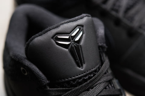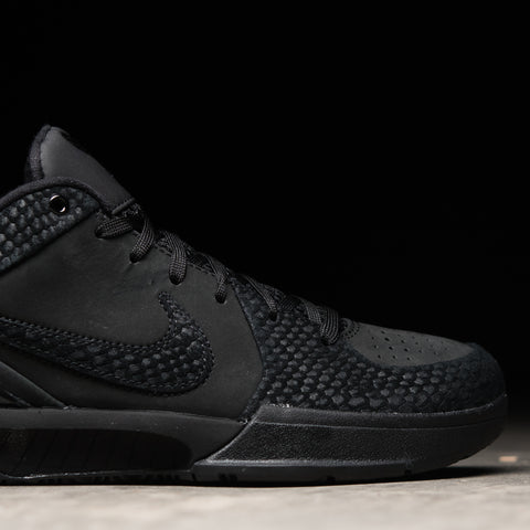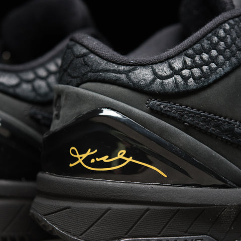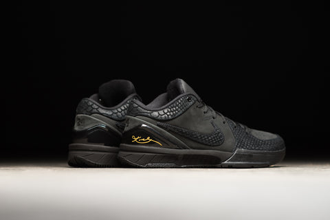 DUBBED THE "GIFT OF MAMBA" THIS KOBE 4 ITERATION NOT ONLY BRINGS ATTENTION TO KOBE'S “BLACK MAMBA” ALTER-EGO BUT ALSO HIS PROFESSIONAL ACCOLADES AND WINNING “MAMBA MENTALITY' THROUGH VARIOUS DESIGN ELEMENTS. BOASTING AN ENTIRELY SLEEK BLACK APPEARANCE, THIS SHOE IS ADORNED WITH FAUX SNAKESKIN THROUGHOUT THE UPPER, KOBE BRYANT ICONIC NUMBER “24” DEBOSSED ON THE HEELS, AND HIS SIGNATURE ETCHED ONTO THE TPU HEEL COUNTER IN A STRIKING GOLD.