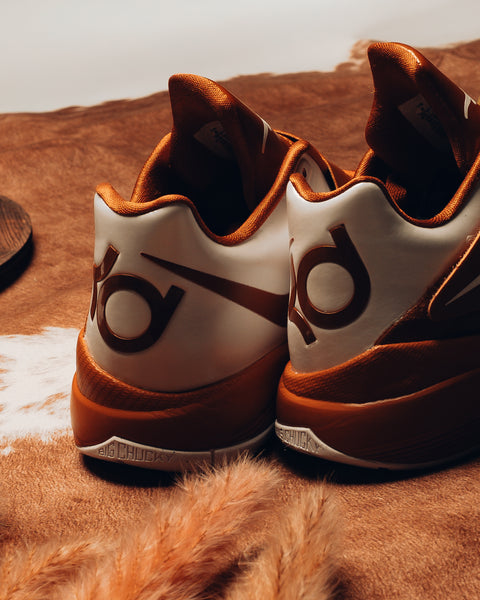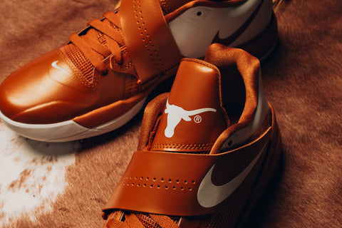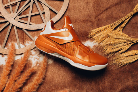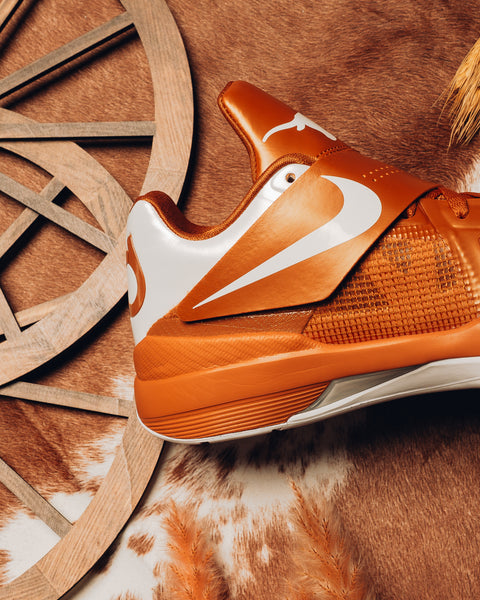The Nike Zoom KD IV 'Texas' bursts onto the scene in a sun-drenched orange upper with crisp white accents and that iconic midfoot strap shouting Texas pride. Its streamlined low-cut silhouette delivers meshed panels for breathability and full-length Zoom cushioning for a responsive propulsion. This drop is a bold reissue steeped in Durant’s Longhorns legacy, balancing heritage in a rich colorway.