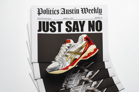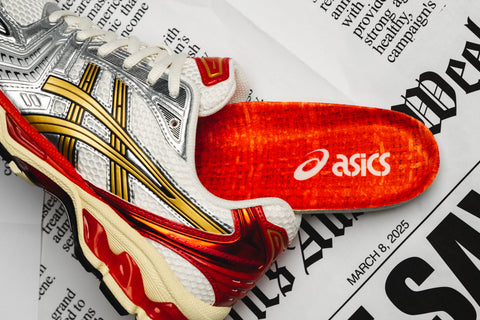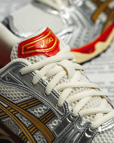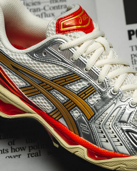 ROOTED IN ’80S PROPAGANDA, THE POLITICS ASICS GEL-KAYANO™ 14 PAIRS CRISP WHITE MESH WITH SILVER OVERLAYS AND PURE GOLD TIGER STRIPES ON BOTH THE MEDIAL AND LATERAL SIDES OF THE SHOE. RED ACCENTS COMPLEMENT THE DESIGN, ON THE TONGUE, TWEED INSPIRED INSOLE, AND THE GEL UNIT, WHILE AN AGED CREAM EVA MIDSOLE MEETS A BLACK AND RED OUTSOLE.