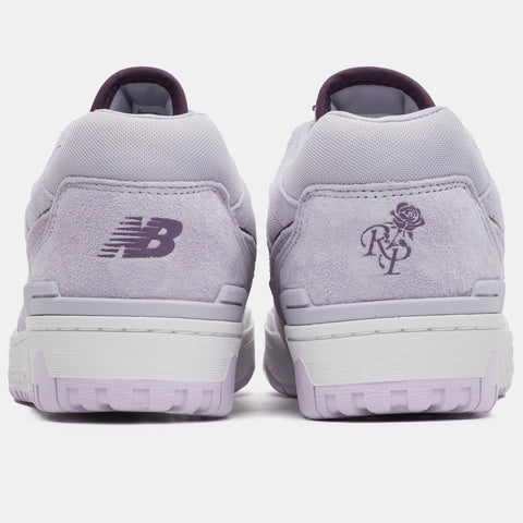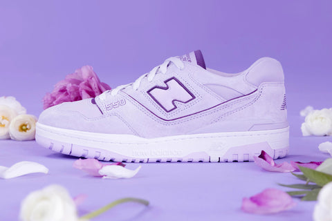 DEPARTING FROM THE SILHOUETTE'S TRADITIONAL LEATHER CONSTRUCTION, THE LATEST COLLABORATION BETWEEN RICH PAUL AND NEW BALANCE'S ICONIC LOW-TOP 550 EMBRACES A COOL COMBINATION OF GREY AND LAVENDER, SHOWCASED THROUGH THE SUEDE OVERLAYS.