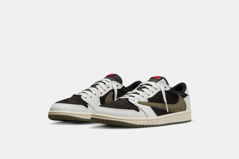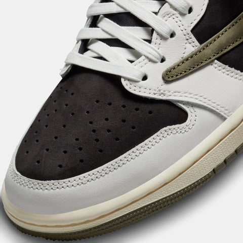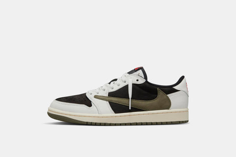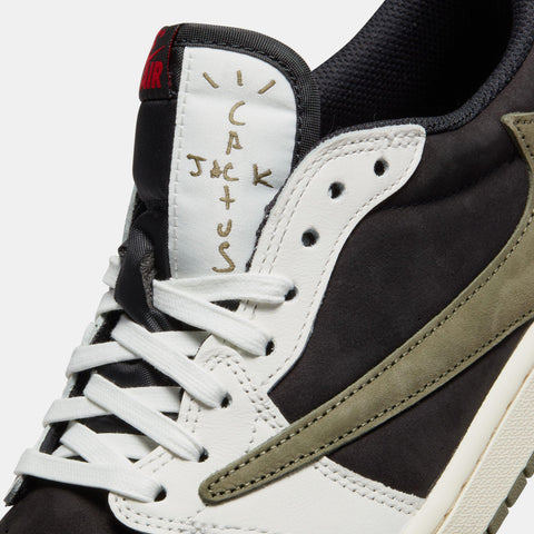 THE LATEST SILHOUETTE TO EXHIBIT TRAVIS SCOTT'S PERSONAL TOUCH IS ANOTHER AIR JORDAN 1 LOW FEATURING ALL OF THE RAPPER'S ICONIC DETAILS, BUT THIS TIME WITH AN OLIVE TWIST. A BLACK SUEDE BASE PAIRS WITH CONTRASTING WHITE LEATHER OVERLAYS AS THE ICONIC BACKWARDS SWOOSH, DRESSED IN OLIVE GREEN, COMPLETES THE UPPER. UNDERFOOT, A SAIL MIDSOLE AND OLIVE OUTSOLE CONNECT WHILE RED NIKE BRANDING ON THE TONGUE AND THE CACTUS JACK FACE LOGO ON THE HEEL SERVE AS THE CHERRIES ON TOP.
