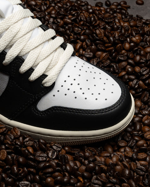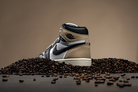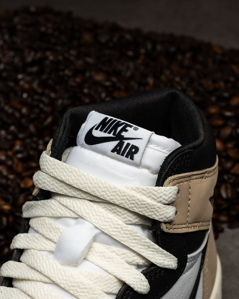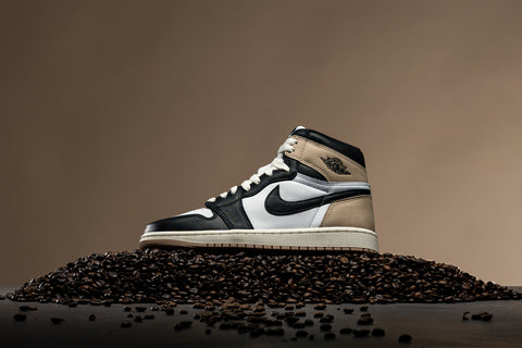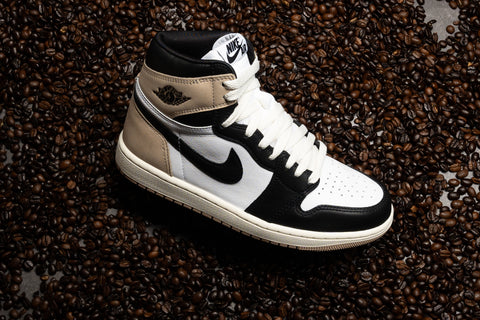 CONTINUING ITS LEGACY, THE AIR JORDAN 1 HIGH INTRODUCES THE EXCLUSIVE WOMEN'S 'LATTE' EDITION, REMINISCENT OF THE POPULAR ESPRESSO-BASED DRINK. CRAFTED ENTIRELY IN LEATHER, THE UPPER FEATURES A BLEND OF WHITE AND "SAIL" HUES, WITH CONTRASTING BLACK ACCENTS ON THE COLLAR, EYESTAYS, MUDGUARD, AND BRANDING ELEMENTS. THE DEFINING 'LATTE' HUE ADORNS THE COLLAR OVERLAY AND HEEL COUNTER, EXTENDING TO THE OUTSOLE FOR A COHESIVE LOOK.