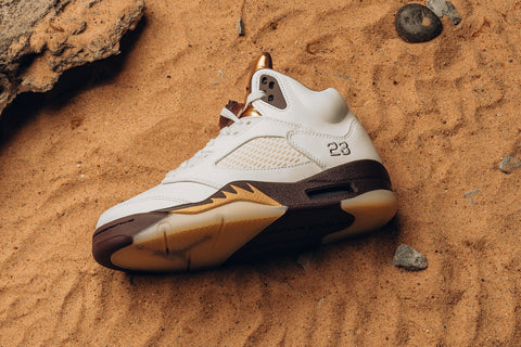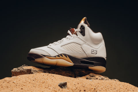 THE JORDAN BRAND PROUDLY CELEBRATES THE 40TH ANNIVERSARY OF THE AIR JORDAN 5 WITH THE AIR JORDAN 5 'EARTH.' THIS BOLD COLORWAY FEATURES RICH, EARTHY BROWN SOCK LINERS AND MIDSOLE, ENHANCED BY LUXURIOUS METALLIC GOLD ACCENTS THAT ELEVATE THE DESIGN. A STITCHED "23" ON THE LATERAL SIDE PAYS TRIBUTE TO THE LEGENDARY JORDAN LEGACY, WHILE THE CLASSIC JUMPMAN LOGO GRACES THE HEEL.