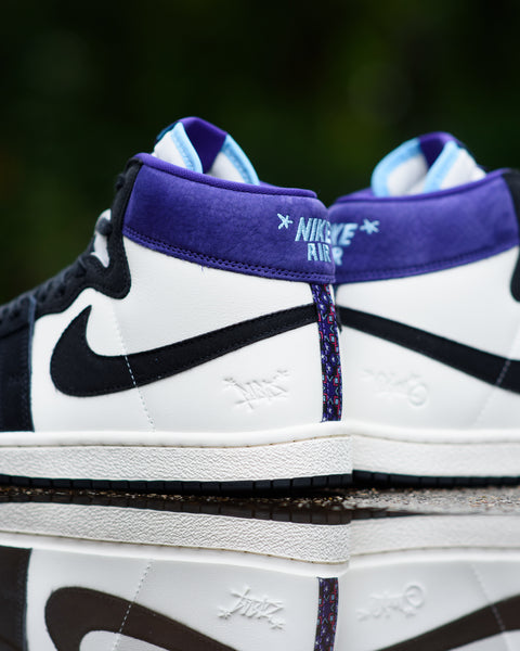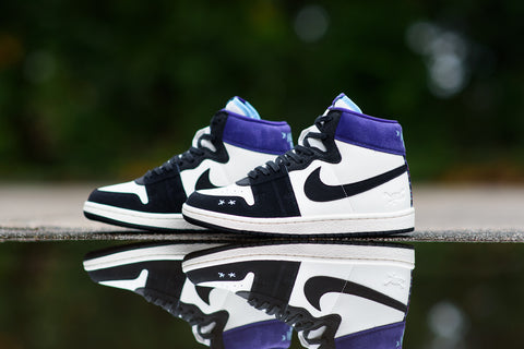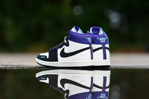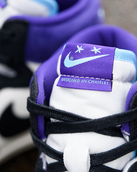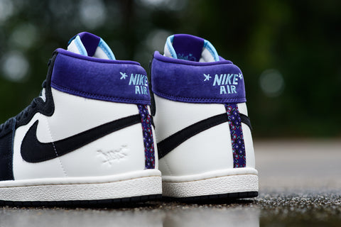 French sneaker store Opium collaborates with Jordan Brand to release the latest Jordan Air Ship. This version features a Sail, Blue Chill, Black, and Court Purple colorway, inspired by the Charlotte Hornets. The sneaker has a sail leather base with perforations on the toe box for breathability. Black details appear on the Swoosh logos, eyestays, and toe overlays, while purple accents highlight the collars and tongue tags, which read "Designed in Charlotte." A retro 90s pattern runs up the spine for a nostalgic touch, and debossed graffiti-style "Paris" text decorates the lateral ankle.