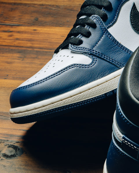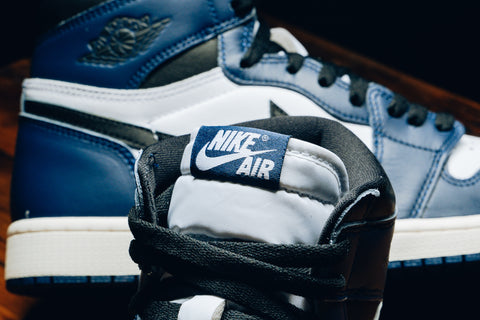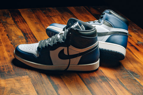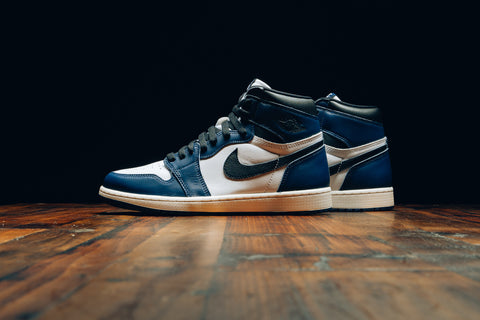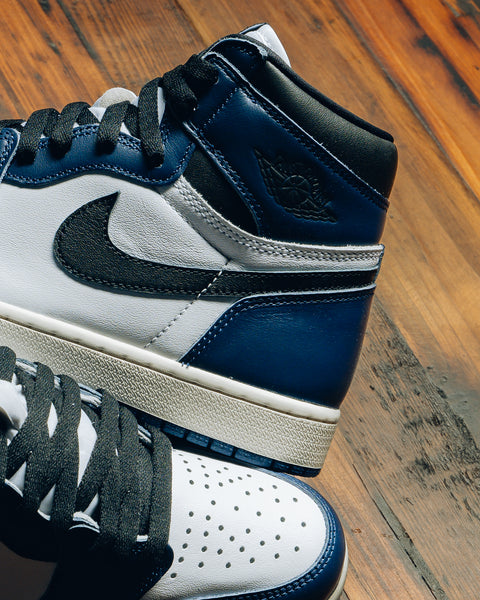 JORDAN BRAND STICKS TO IT'S CLASSIC COLOR BLOCKING WITH THE NEW ‘MIDNIGHT NAVY’ EDITION. THIS ITERATION REPLACES THE TRADITIONAL RED WITH ‘MIDNIGHT NAVY’ ON THE OVERLAYS AND OUTSOLE WHILE RETAINING THE BLACK AND WHITE ELEMENTS OF THE ORIGINAL DESIGN. A SAIL-COLORED MIDSOLE ADDS A VINTAGE TOUCH, AND THE SNEAKER IS FINISHED OFF WITH A MIDNIGHT NAVY RUBBER OUTSOLE.