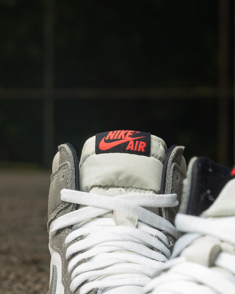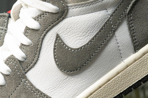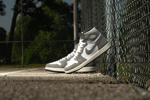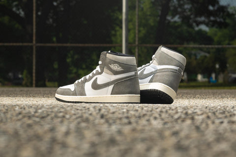 THIS FRESH NEW TAKE ON THE AIR JORDAN 1 HIGH SHOWCASES A PRISTINE WHITE LEATHER UPPER, ACCENTUATED BY STRIKING SUEDE BLACK WASHED OVERLAYS. GREY DETAILING IS SEEN THROUGHOUT THE SILHOUETTE WHILE UNDERSTATED TOUCHES OF RED ENCOMPASS THE BRANDING. THE SNEAKER IS ANCHORED BY A SAIL STITCHED MIDSOLE AND A BLACK RUBBER OUTSOLE, COMPLETING THE OVERALL AESTHETIC.