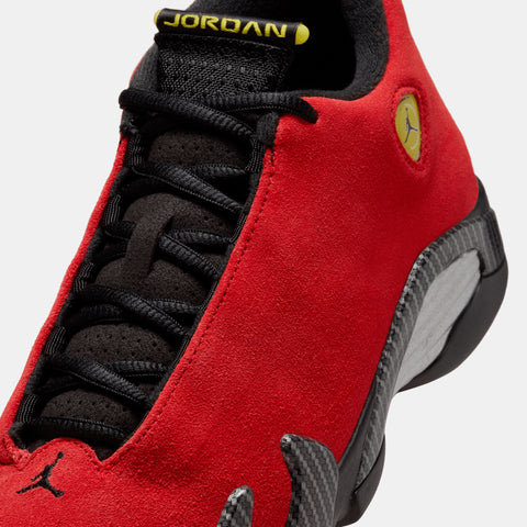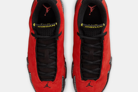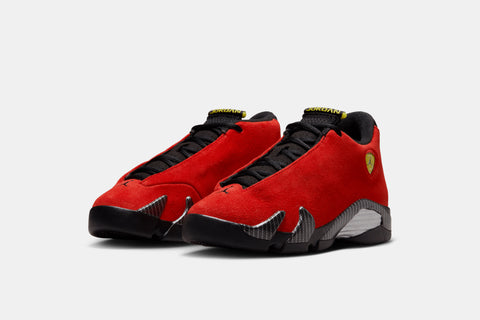 Inspired by Italian supercar engineering, the Air Jordan 14 ‘Ferrari’ pairs bold racing style with high-performance design. Red suede uppers echo the paint jobs of MJ’s favorite cars, while carbon fiber midsole shanks and metallic detailing reinforce its speed-driven look. The iconic shield logo and tire tread-inspired outsole complete the design—made to move fast and turn heads.