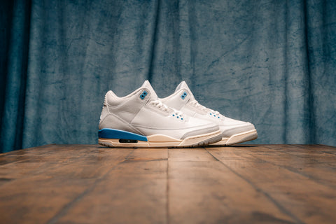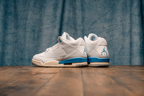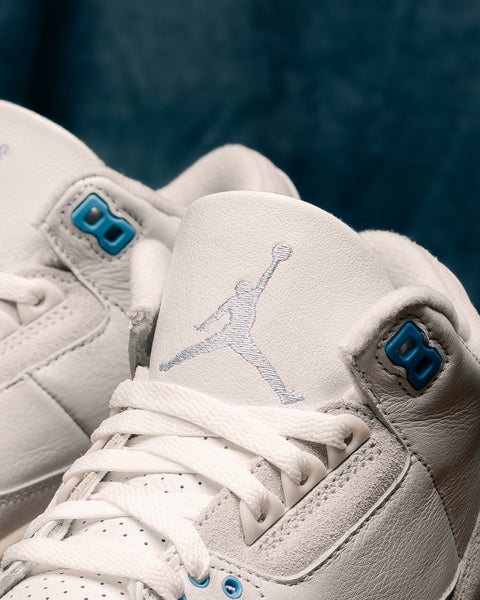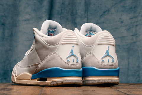 JORDAN BRAND SALUTES MJ’S GOOD-LUCK CHARM WITH THE AIR JORDAN 3 “LUCKY SHORTS.” DRAWING FROM HIS UNC PRACTICE SHORTS, THIS PAIR BLENDS HYDROGEN BLUE AND SAIL, EMBODYING THE RITUAL THAT CONNECTED HIS COLLEGE SUCCESS TO NBA DOMINANCE.