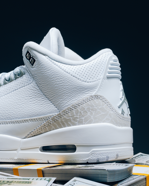 The Air Jordan 3 Retro ‘Pure Money’ brings back the clean white-on-white look with hints of metallic silver for a polished finish. Subtle elephant print and a chrome Jumpman keep this retro classic and clean.