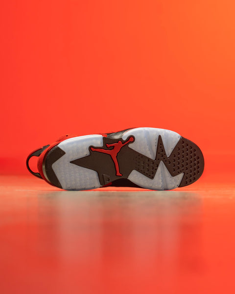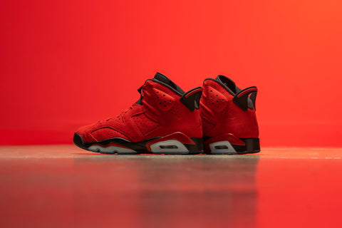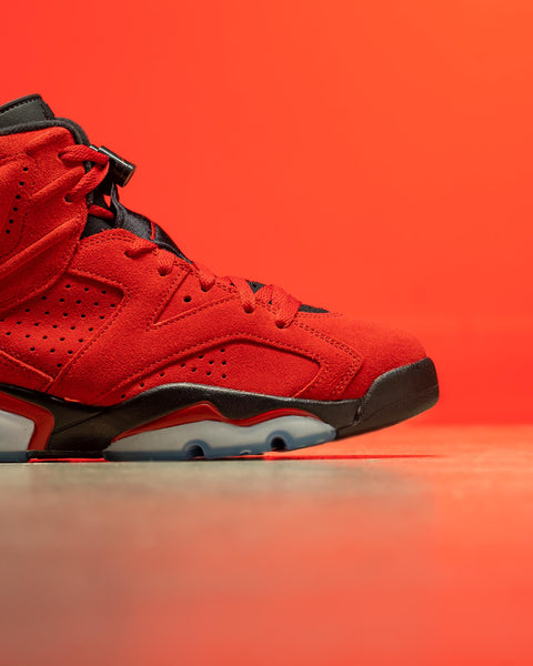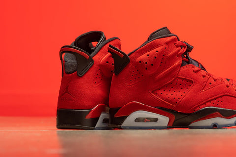 THE FAN-FAVORITE AIR JORDAN 6 'TORO', FROM 2009'S 'RAGING BULL' PACK, IS FINALLY SEEING ITS SUCCESSOR RECEIVE THE SAME ICONIC RED SUEDE MAKEOVER. A UNIQUE HOMAGE TO MJ'S CHICAGO BULLS, THIS RENDITION OF THE AJ6 SEES THE ENTIRETY OF ITS UPPER CONSTRUCTED FROM PREMIUM SUEDE WITH A HOT RED FINISH. THE TONGUE, COLLAR LINING, AND MIDSOLE SERVE TO CONTRAST THE UPPER IN A SLEEK BLACK HUE, WHILE AN ICY TRANSLUCENT OUTSOLE SITS UNDERNEATH.