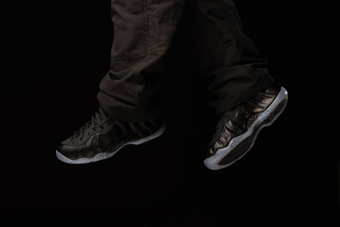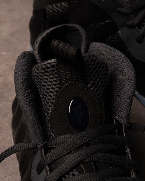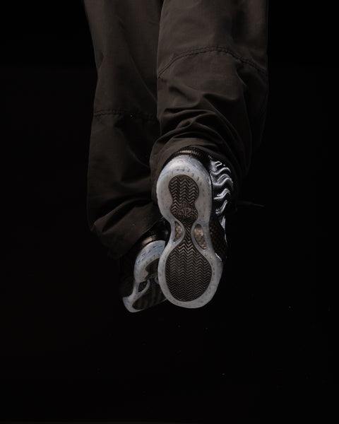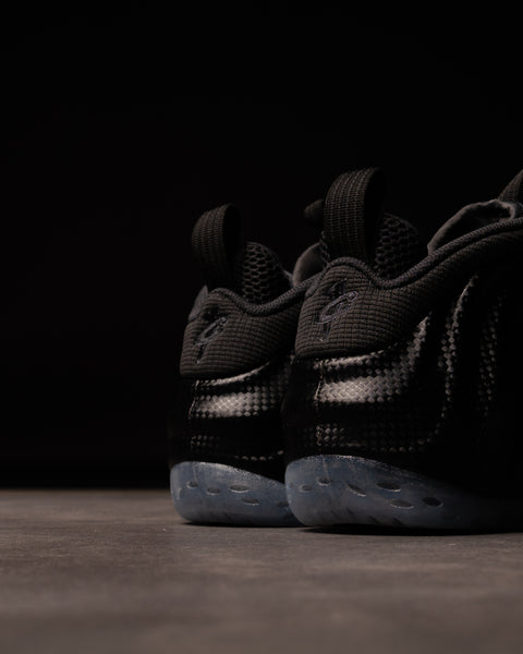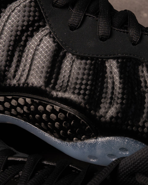 The Nike Air Foamposite One in 'Carbon Fiber' arrives as a shadowy statement, with its sleek, molded Foamposite shell delivering one seamless wave of pitch-black intensity. Subtle smoky-gray accents trace the eyestays and lace loops, while the outsole carries a quiet contrast that whispers sophistication. Underneath, the Zoom Air cushioning and durable rubber tread keep it anchored to performance.