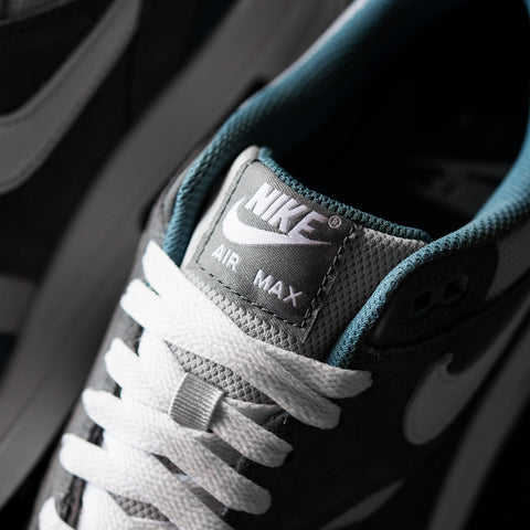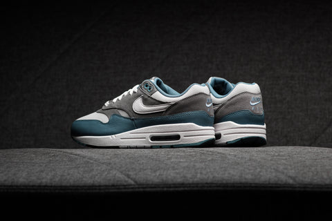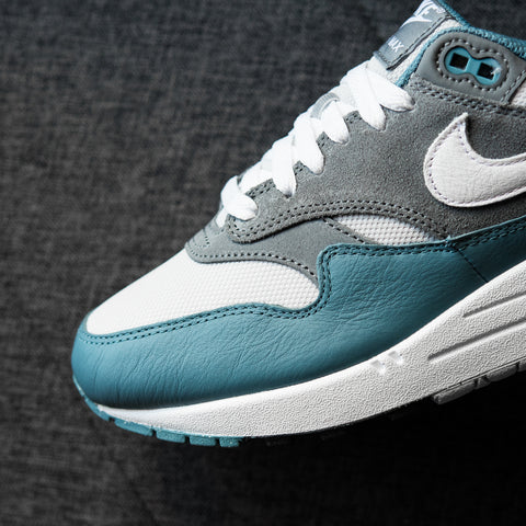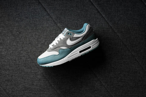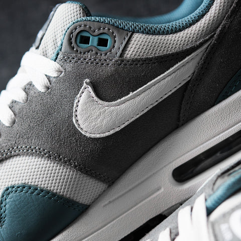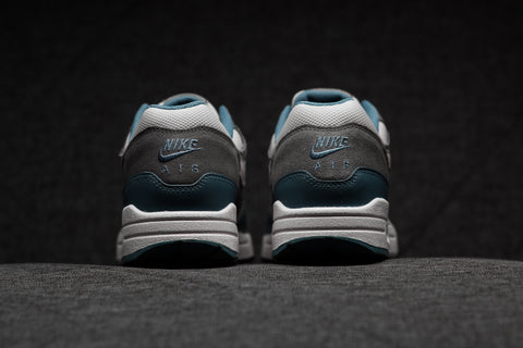 THIS ITERATION OF THE NIKE AIR MAX 1 SHOWCASES A CLEAN, PURE WHITE MESH BASE, ACCENTUATED BY TUMBLED LEATHER SWOOSHES, LACES, AND MIDSOLE IN A MATCHING WHITE SHADE. THERE ARE GREY SUEDE OVERLAYS, TONGUE LABELS, AND WAVY MUDGUARDS IN A NOD TO THE 1987 STYLE. THE THEME OF NOISE AQUA CONTINUES TO THE INNER LINING, WITH NIKE AIR BRANDING EMBROIDERED ON THE HEELS AND CERTAIN PARTS OF THE RUBBER OUTSOLE. WHAT'S ESPECIALLY NOTEWORTHY IS THE VISIBLE AIR MAX UNIT IN THE HEEL, WHICH INCLUDES BLACK AND WHITE ACCENTS UNDERNEATH, RESULTING IN A COMPREHENSIVE AND BALANCED DESIGN.
