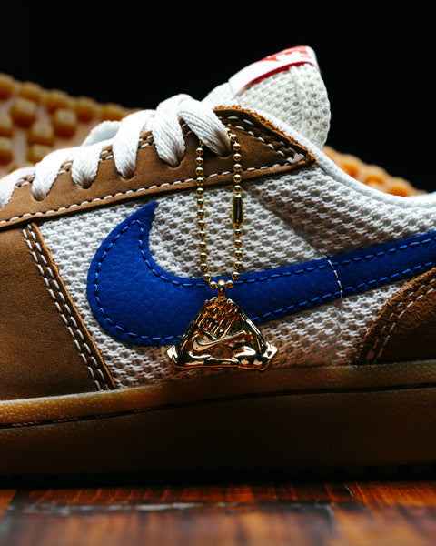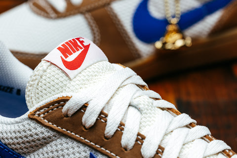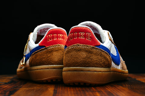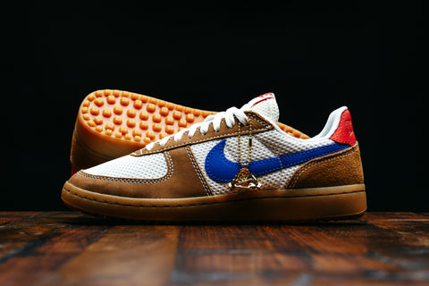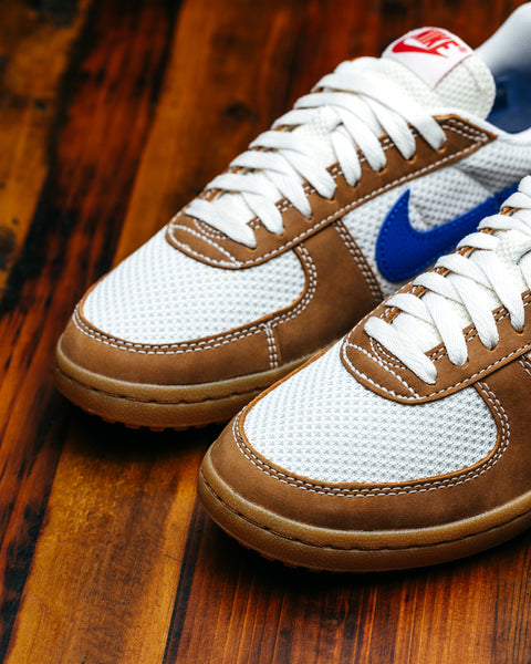The Nike Field General 'Culture of Football' returns with gridiron guts and a street-ready soul. A bold mix of vintage football DNA and modern edge, a white mesh base and brown suede overlays create the backdrop for the blue leather swoosh. Resting on a gum midsole and outsole, the final touch is a shiny, golden hang tag of hands.
