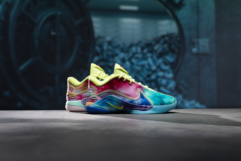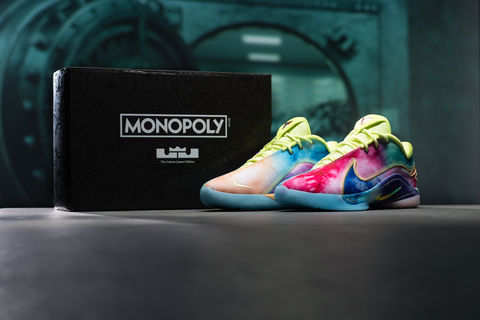 NIKE BASKETBALL AND MONOPOLY COME TOGETHER FOR THE LEBRON 22 “WHAT THE MONOPOLY.” A MISMATCHED TIE-DYE DESIGN, STITCHED MONOPOLY TAGS, AND A THEMED BOX BRING THE ICONIC BOARD GAME TO LIFE.