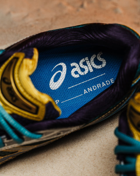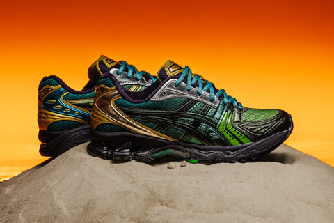 BRAZILIAN BRAND P. ANDRADE AND ASICS ARE LAUNCHING A COLLABORATION FEATURING THE GEL-KAYANO 14 SILHOUETTE. THIS DESIGN FUSES TECHNICAL, AVANT-GARDE, AND NATURAL STYLES WITH VIVID HUES OF GREENS. THE SHOE'S MESH UPPER FEATURES A GRADIENT OF NEON GREEN AND BLUE-GREEN, WITH GOLD, SILVER, AND TURQUOISE ACCENTS ON THE BACK DECAL, SIDE LOGO, AND EYESTAYS. A BLACK SOLE, BLUE LACES, AND A NAVY/GOLD TONGUE ADD CONTRASTING TOUCHES, CREATING A UNIQUE BLEND OF NATURAL AND METALLIC TONES.