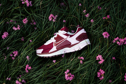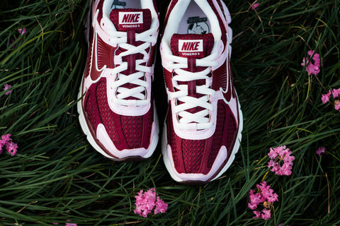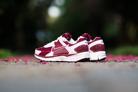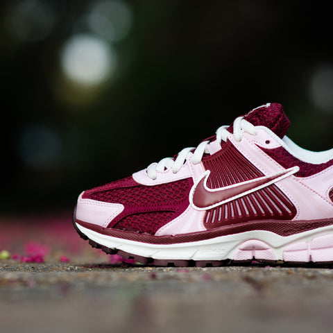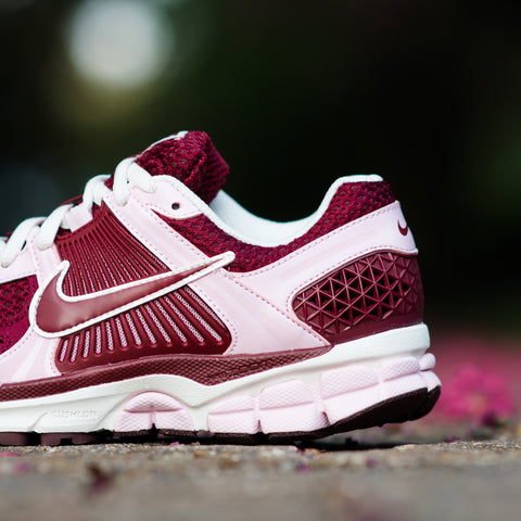 AFTER FADING INTO OBSCURITY, THE NIKE ZOOM VOMERO V IS BACK IN FULL SWING, RETURNING TO THE MAINSTREAM OF LIFESTYLE FOOTWEAR. THIS IS THANKS TO A VARIETY OF UNIQUE NEW COLOR SCHEMES INCLUDING THIS 'PINK FOAM' VARIANT, FEATURING A HOT SHADE OF RED ON THE MESH BASE AND SWOOSH WITH THE LEATHER OVERLAYS DEVIATING IN A LIGHT PINK.